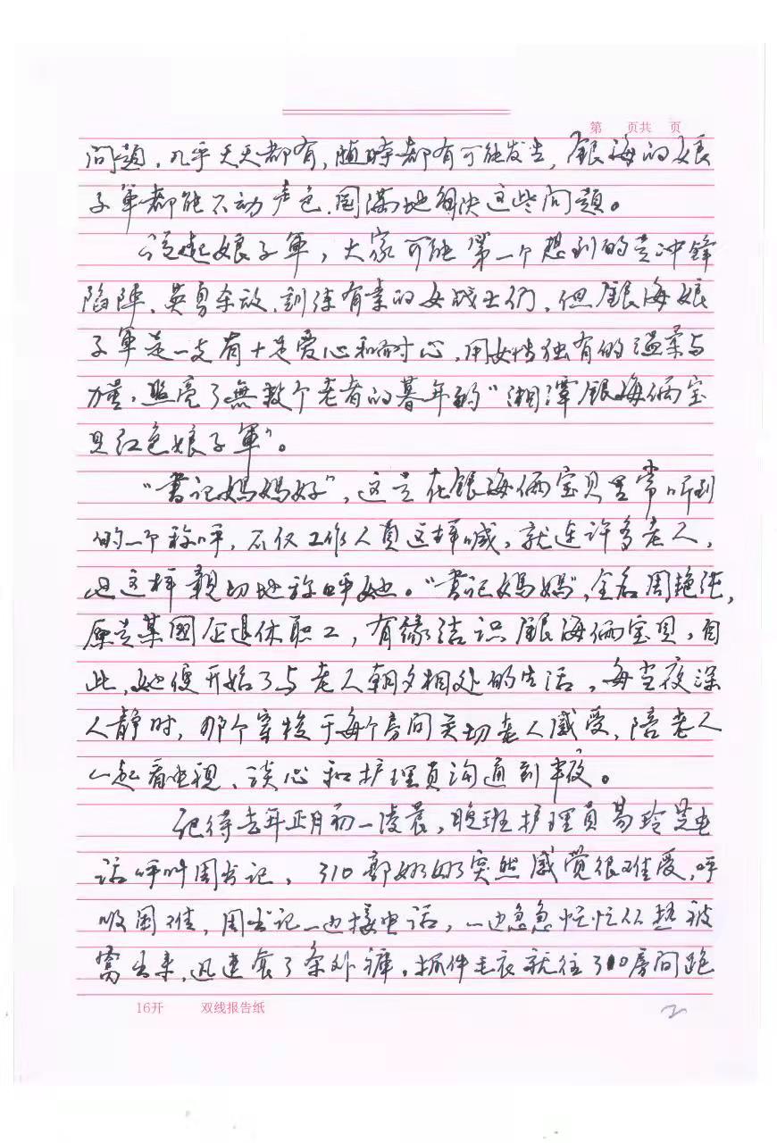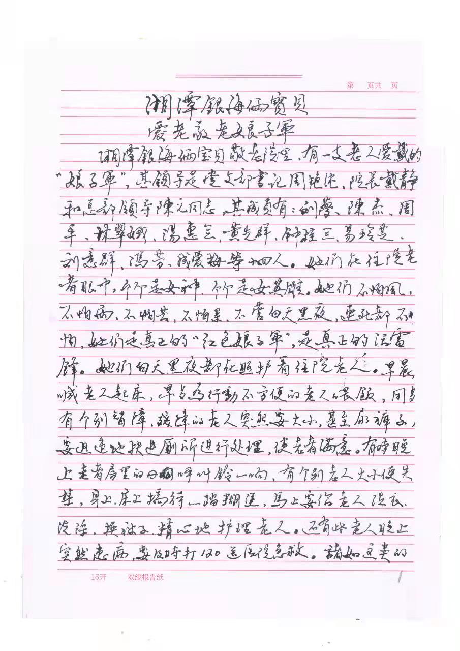 湘潭银v俩宝贝康养院里,有一支老h爱戴?/span>“娘子军”,光导是党支部书记周艳纯、院长戴?rn)和总部领导陈元同志。其成员有:(x)刘梦、陈杰、周q뀁林娥、汤惠兰、黄先群、钟桂南、易玲芝、刘意群、冯芟뀁成爱枚{十四h。她们在住院老者眼中,个个是女、个个是奌雄。她们不怕风Q不怕雨Q不怕苦Q不怕篏Q不白天黑夜,q死亡都不畏惧,她们是真正的“红色娘子军”,是真正的z雷锋。她们白天黑夜都在照护着住院老hQ早晨喊老h起床Q早ؓ(f)行动不便方的老h喂饭Q用有个别认知障碍的老hH然要大便甚至了(jin)裤子Q要q速地扶进厕所q行处理Q老者满意。有时晚上老者房里的呼叫铃一响,有个别老h大小便失,……马上要l老hz、洗澡、换被子Q精?j)地护理老h。还有些老h晚上H然(zhn)病Q要?qing)时?/span>120送医院急救Q诸如这cȝ问题Q几乎天天都有,随时都有可能发生Q银L(fng)娘子军都能不动声艌Ӏ圆满地解决q些问题?/span>