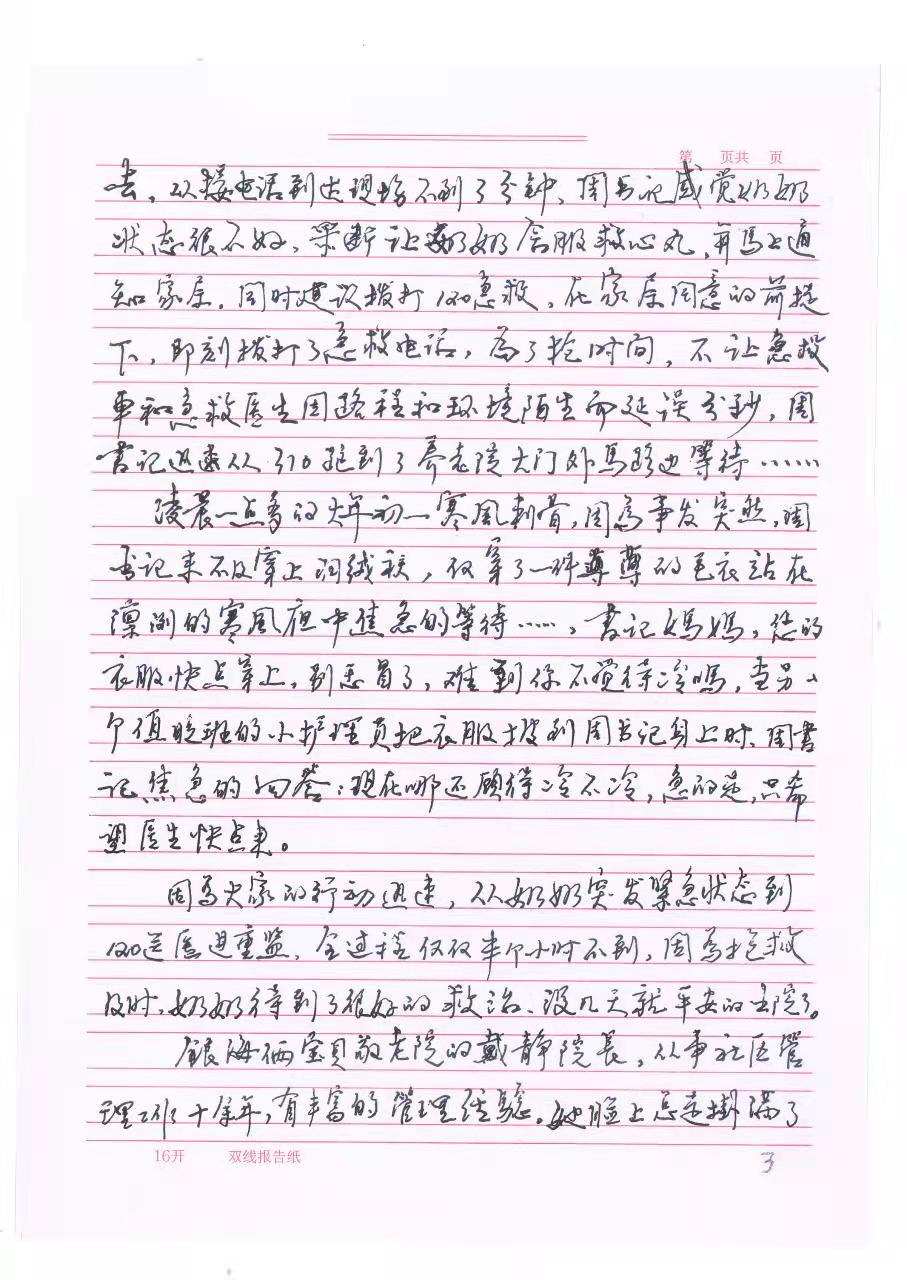 记得今年正月初一凌晨1Ҏ(gu)Q晚班护理员易玲芝电(sh)话呼叫周书记Q?/span>310郭奶奶突然感觉很隑֏Q呼吸困难,周书CҎ(gu)?sh)话一Ҏ(gu)急忙忙从热被H出来迅速套?jin)条外裤Q抓件毛衣就往310戉K跑去。从接电(sh)话到辄Z?/span>3分钟Q周书记感觉奶奶状态很不好Q果断让奶奶含服速效救心(j)丸,q上通知家属Q同时徏议拨?/span>120急救Q在家属同意的前提,卛_拨打?jin)急救?sh)话。ؓ(f)?jin)抢旉Q不让急救车和急救ȝ因\E和环境陌生而g误分U,周书记迅速从310跑到?jin)养老机构的大门外马路边{待…?/span>凌晨一点多的大q初一寒风刺骨Q因Z发突然周书记来不?qing)穿上羽l袄Q仅I一件薄薄的毛站在凛冽的寒风夜中焦急的{待……?/span>书记妈妈Q?zhn)的服快点穿上,别感冒?jin)Q难道你不觉得冷?/span>?/span>当另一个值晚班的护理姐姐把衣服披到周书记w上Ӟ周仍然很焦急的回答?/span>现在哪还־上冷不冷Q急得不得?jin),只希望医生快?gu)?/span>
