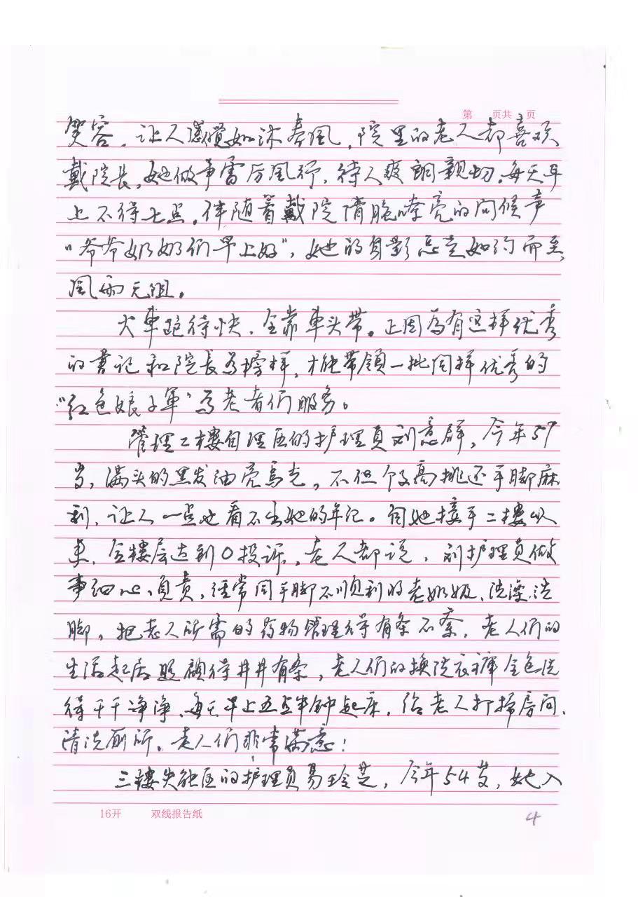 理二楼自理区的护理员刘意群Q今q?/span>57岁,满头的黑发a(b)亮乌光,不仅个子高挑q手脚麻利,让h一点也看不出她的年U。自Ҏ(gu)手二g来,全楼层达?/span>0投诉Q老h都说刘姨做事认真l心(j)负责Q经常同手脚不顺利的老奶奶洗澡洗脚,把老h所需的药物管理的有条不紊Q老h们的生活起居照顾的井井有条,老h们的换洗裤全都z得q干净净Q每天早上五点半钟v床,l老h打扫戉K、清z厕所Q老h们非常满意!