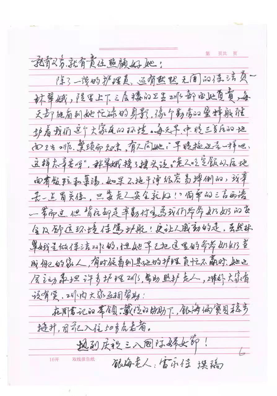 除了(jin)一U的护理员,q有默默无闻的保z员林翠娥,院里上下三层楼的卫生工作都由她负责,每天都能看到她忙忙碌的w媄(jing)Q像个勤劳的蜜蜂般维护着我们q个大家庭的环境。每天早中晚三餐后的地面清洁工作Q繁琐而无呻I我曾问她Q?/span>“早晚拖也是一样吧Q这样太辛苦?jin)呀”。林娥摇了(jin)摇头Q“老h吃完饭以后地面有饭粒和菜汤,如果不拖q净很容易摔倒的Q我辛苦一Ҏ(gu)关系Q只要老h安全好Q”简单的三言两语一带而过Q但背后却是日复一日的辛勤付出为我们爷爷奶奶的安全?qing)舒适环境保驾护航!