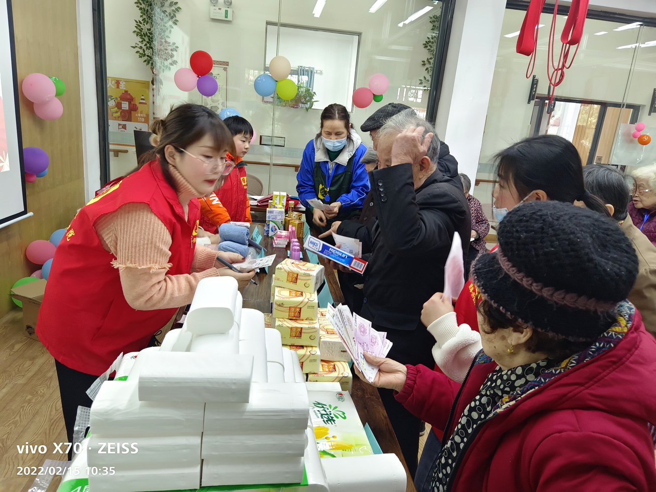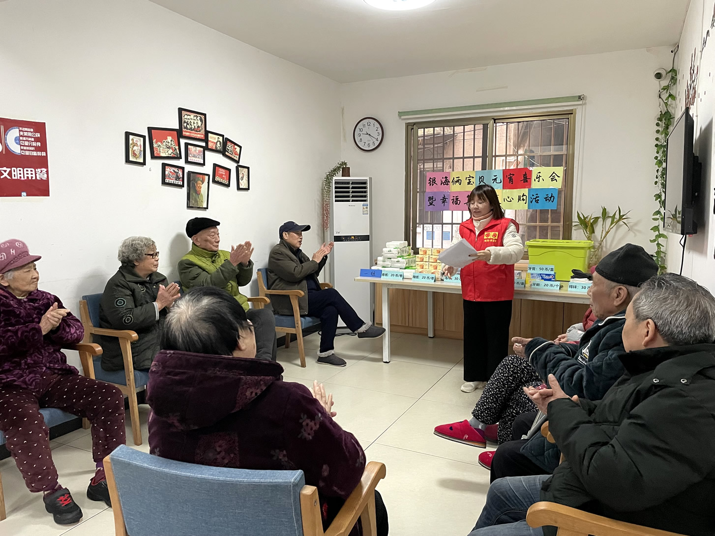 經過一系列的比拼過后,每位爺爺奶奶都收獲到了不等的幸福幣,結合近期的活動出勤、興趣小組參與(遛鳥、養(yǎng)魚、澆花、擇菜等)、以及各類好人好事,爺爺奶奶們通過自己辛勤的勞動都拿到了相應的“薪酬”。拿到工資的他們,認真挑選著自己需要的物品,集市上人群熙攘,熱鬧非凡。