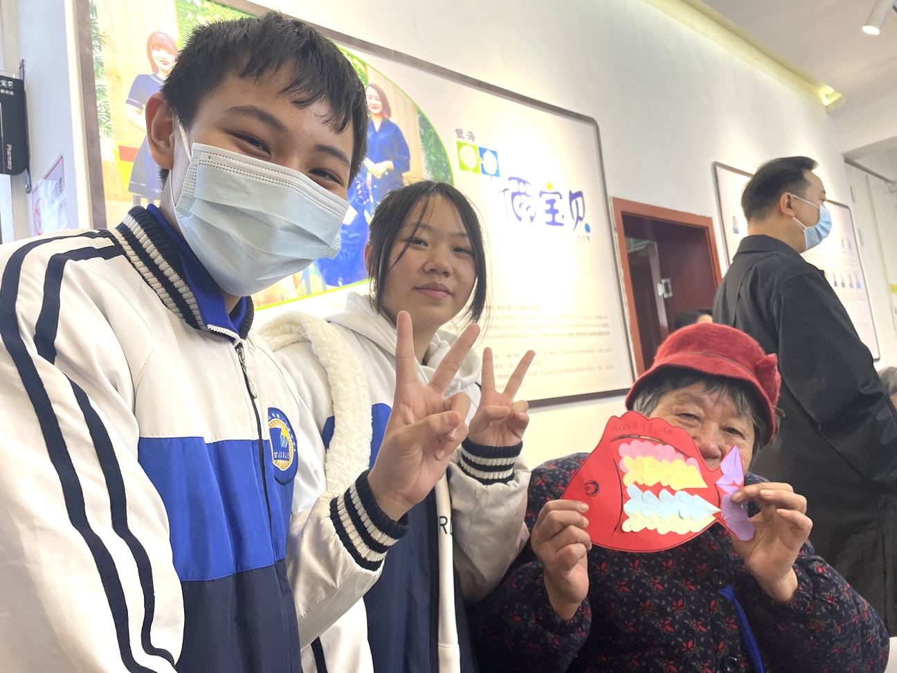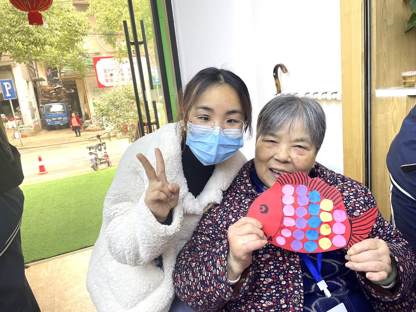 “爺爺,您喜歡這個(gè)顏色是嗎?下面我?guī)椭黄鸢阉舫鰜?lái)好嗎?”、“奶奶,您平常都有些什么愛好呀,可以跟我們說(shuō)說(shuō)您的故事嗎?”……只見同學(xué)們有的蹲坐在老人旁邊,有的則是伏耳于他們面前,耐心認(rèn)真地和爺爺奶奶們進(jìn)行交流,其他的人則是分工協(xié)作,完成“魚”的其他部位制作。不多久,一條條色彩斑斕,創(chuàng)意十足的“魚”就做好啦!爺爺奶奶們拿著完成的作品分別和自己的“小伙伴”們合影留念,再次感謝他們的到來(lái)!