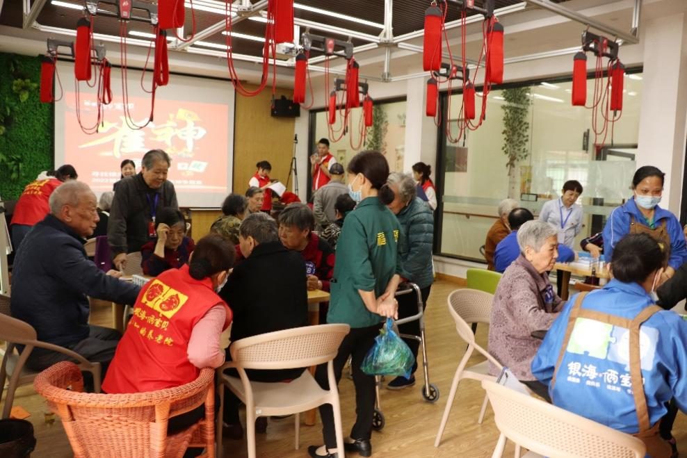 5月18日,在爺爺奶奶們熱忱的期盼中銀海倆寶貝第二屆雀神爭(zhēng)霸賽拉開了帷幕。一大早,其他各銀海倆寶貝長(zhǎng)者照護(hù)之家的參賽人員匯聚在唐興寺社區(qū)銀海倆寶貝長(zhǎng)者康養(yǎng)中心。在經(jīng)過貼序號(hào)牌、抽簽、簽名和留影環(huán)節(jié)后,參賽人員入座,每人分發(fā)20元幸福幣。