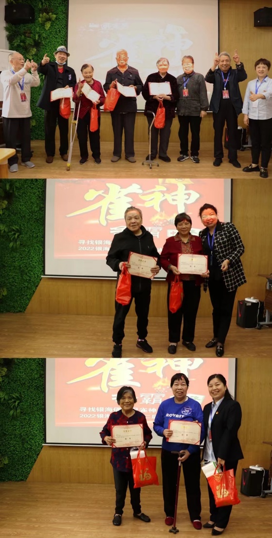 又經(jīng)過八把后,比賽結(jié)束。在裁判員們統(tǒng)計(jì)完幸福幣后,獲獎(jiǎng)名單出爐。獲得季軍的是來自龍子巷社區(qū)長(zhǎng)者照護(hù)之家的陳奇爺爺、菊花塘社區(qū)長(zhǎng)者照護(hù)之家的戴漸輝奶奶、古梁巷社區(qū)長(zhǎng)者照護(hù)之家的何振輝奶奶和唐興寺社區(qū)長(zhǎng)者康養(yǎng)中心的王芝明爺爺。獲得亞軍的是來自龍子巷社區(qū)長(zhǎng)者照護(hù)之家的唐樹民爺爺和來自唐興寺社區(qū)長(zhǎng)者康養(yǎng)中心的吳嫦娥奶奶。獲得冠軍的是來自龍子巷社區(qū)長(zhǎng)者照護(hù)之家的陳必元奶奶和來自唐興寺社區(qū)長(zhǎng)者康養(yǎng)中心的周愛霞奶奶。值得一提的是陳必元奶奶是蟬聯(lián)銀海倆寶貝第一、第二屆雀神爭(zhēng)霸賽冠軍,牌技精湛。