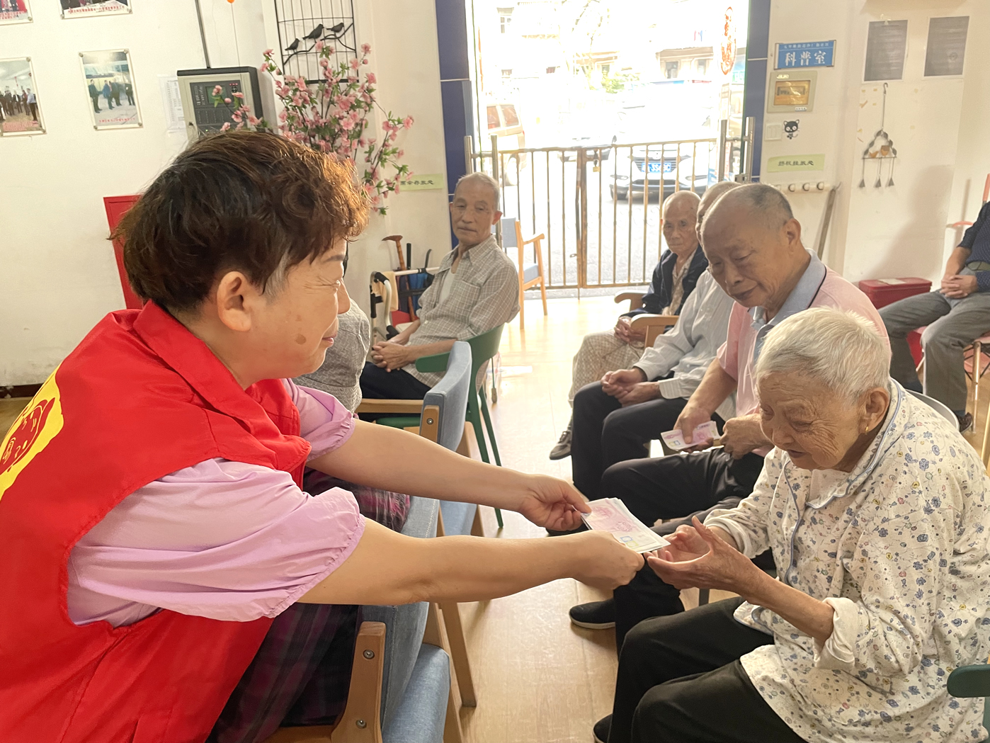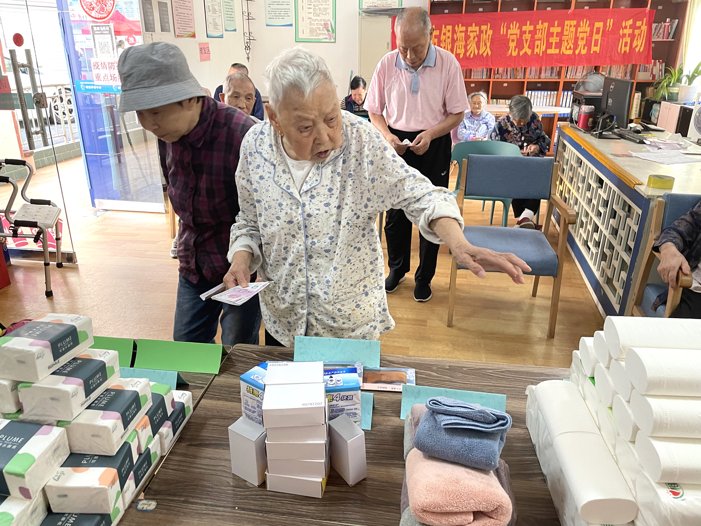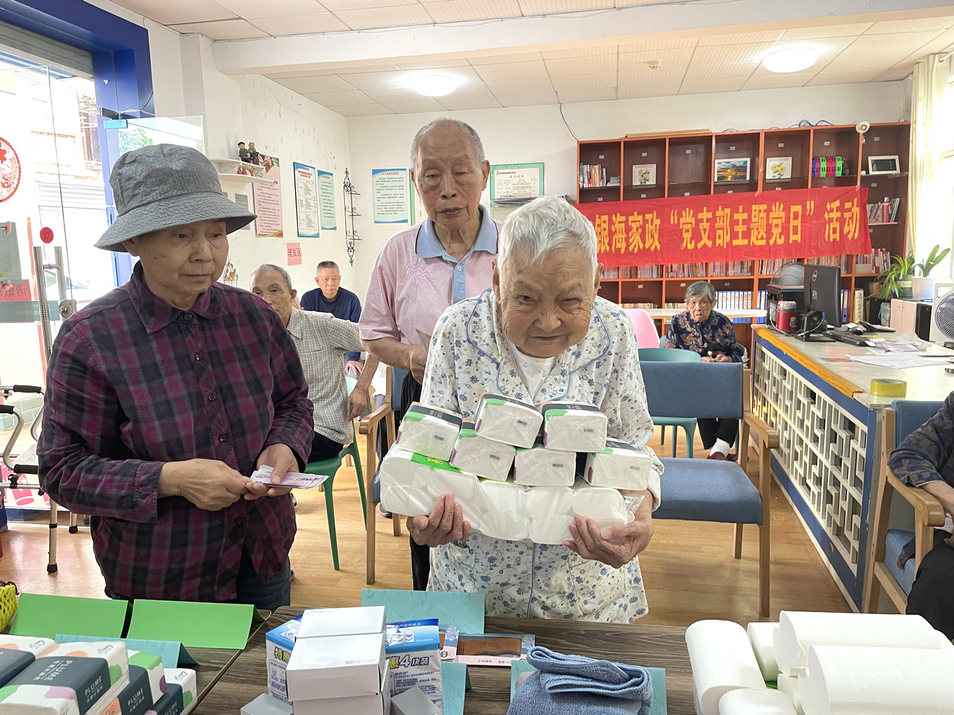 長者們?nèi)粘5幕顒?dòng)有:擇菜、澆花、養(yǎng)魚、遛鳥、還有各類康樂活動(dòng)、康復(fù)訓(xùn)練等等,他們在收獲健康、快樂、成就感的同時(shí),也賺到了不少的工資——幸福幣。每個(gè)季度開放一次的幸福銀行兌換日里,爺爺奶奶則可以用自己的“工資”開啟隨心購模式,爺爺奶奶們可以用掙到的幸福幣直接在院內(nèi)購買生活用品。