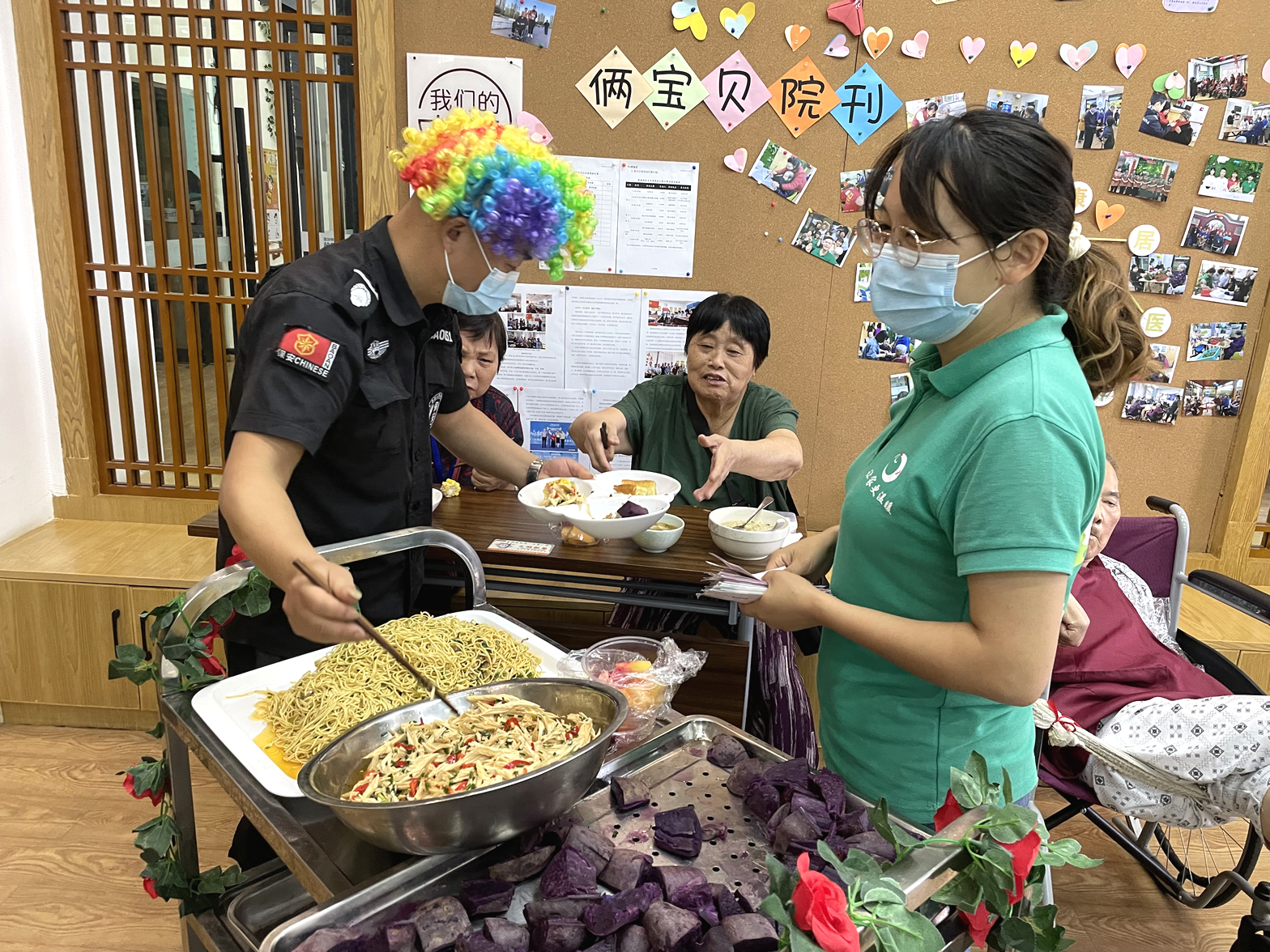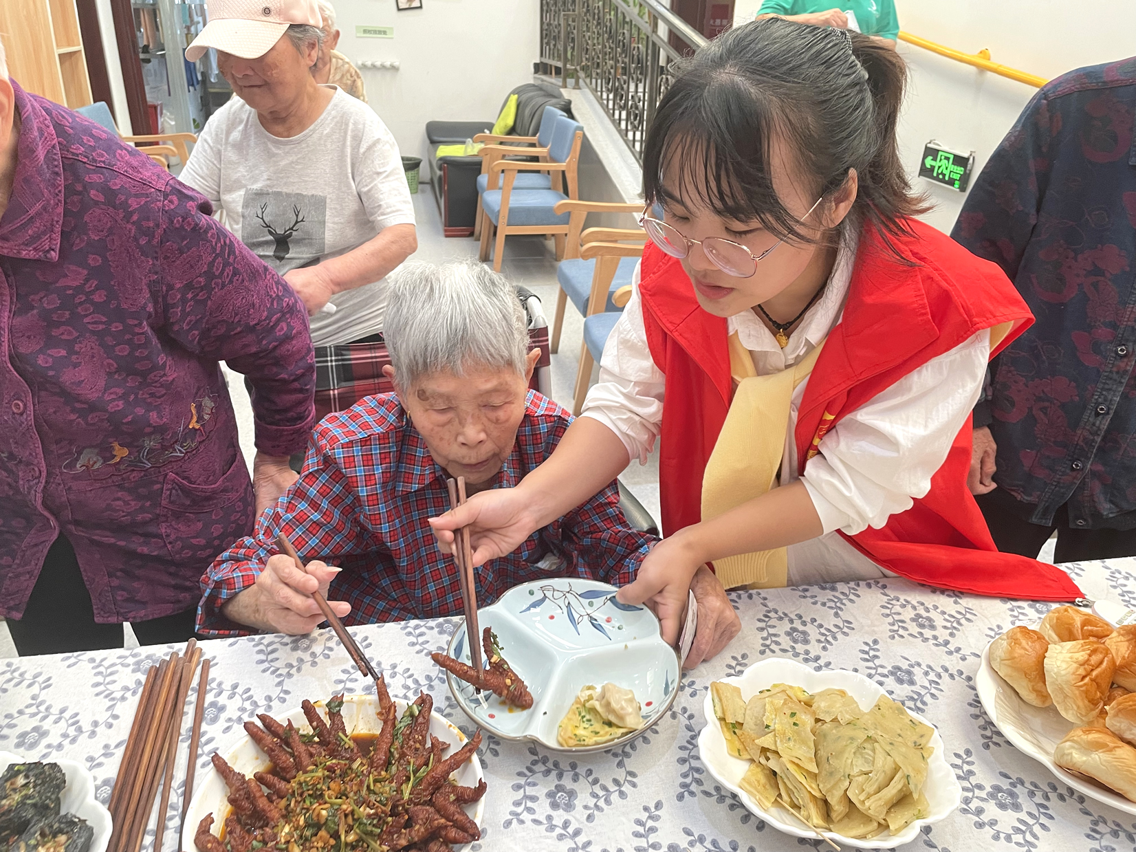 現(xiàn)場食物十分豐富,有重陽花糕臭干子、虎皮鳳爪小籠包、餛飩、蒸餃、涼面、炒粉、蒸玉米、紫薯、油條、涼拌菜、水果拼盤等美食陸續(xù)端上來,格外美味的各種小吃,種類繁多,色香味俱全。爺爺奶奶們每天吃食堂的飯菜,時(shí)不時(shí)換點(diǎn)新花樣,都很高興,想吃什么,用手上的幸福幣直接購買就行。爺爺奶奶們一邊感受著自己賺錢自己花的快樂一邊品嘗著喜歡的小食,整個(gè)現(xiàn)場其樂融融、熱熱鬧鬧。行動(dòng)不便的爺爺奶奶們也沒關(guān)系,工作人員送到身邊隨他挑選。